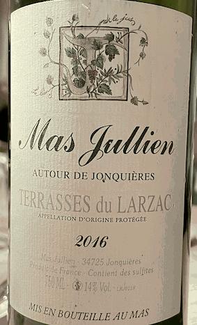 La cuvée de Terrasses du Larzac "Autour de Jonquières" du Mas Jullien est construite sur les cépages carignan, mourvèdre, syrah et grenache. Robe rubis sombre en novembre 2025 pour ce millésime 2016. Joli nez mêlant des notes de tabac et d'épices douces. La bouche est relativement austère dans ce millésime du fait d'un acidité bien présente qui masque la richesse évidente de ce vin (14°) par ailleurs frais et élégant, tout en finesse. Il sera plus abouti d'ici dans quelques années car les vins du domaine vieillissent avec grâce dans les deux couleurs.